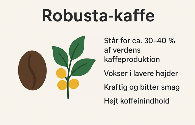 Koffein: Indeholder næsten dobbelt så meget koffein som arabica. Det giver en mere intens kop og en naturlig beskyttelse mod insekter.